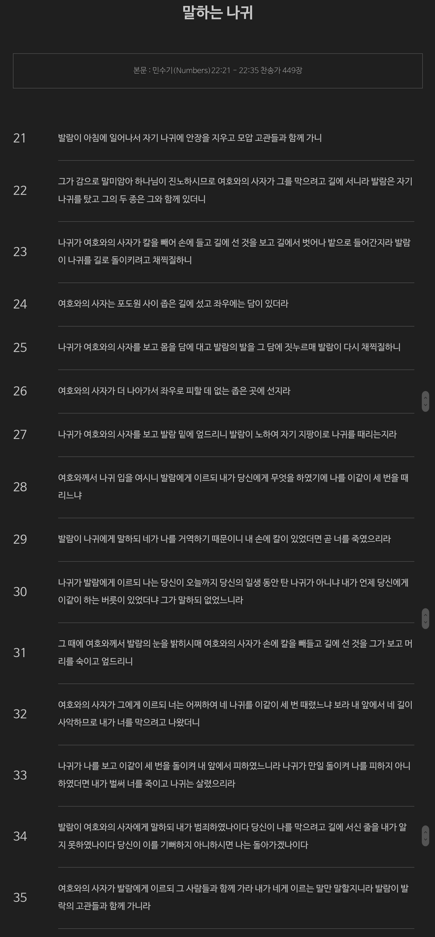 - 오늘 민수기에서는 어제에 이어 발람이 결국 모압의 높은 사람들과 모압으로 떠나게 됩니다. 하지만, 가는 길에는 하나님의 천사가 길을 막고 있었고 발람은 이를 보지 못하나 나귀는 이를 보고 피하게 됩니다. 발람은 가고자 하는 길로 가지 않는 나귀를 때립니다. (민 22:21-23)
