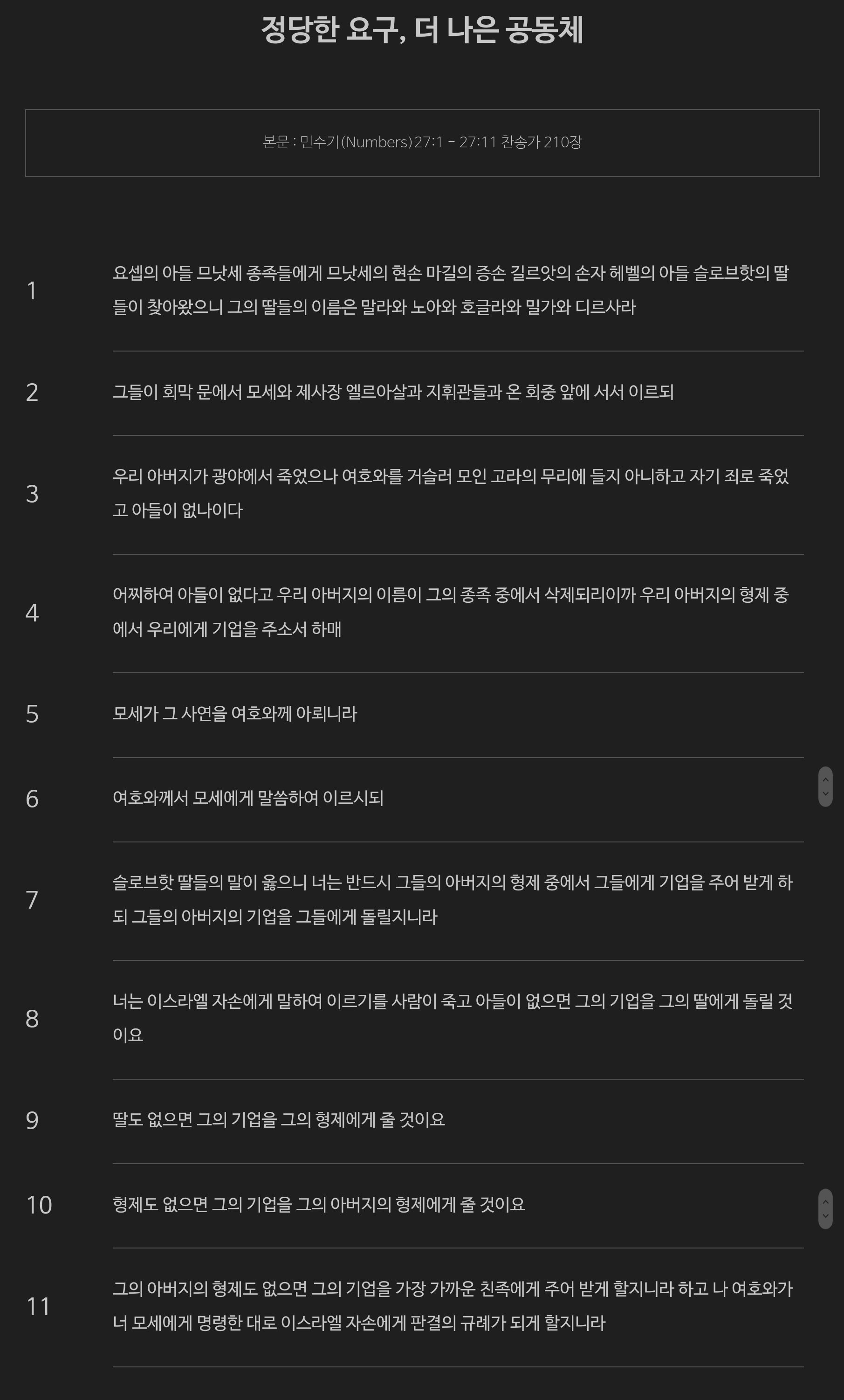 - 하나님께 호소하는 오늘 2절의 '회막 앞에서' 라는 부분은 여러 부분으로 묵상이 되었는데, 슬로브핫의 딸들은 어떤 부당함이 될 수 있는 것에 대해 "적극적"으로, 그리고 "하나님 앞에" 주장하고 도움을 호소하였습니다. 무언가 우리 앞에 마주하게 되는 부당한 것들에 대해 우리도 적극적이었는지, 또 우리도 하나님께 호소하는 습관이 있는지를 돌아보는 계기가 되는 구절입니다.