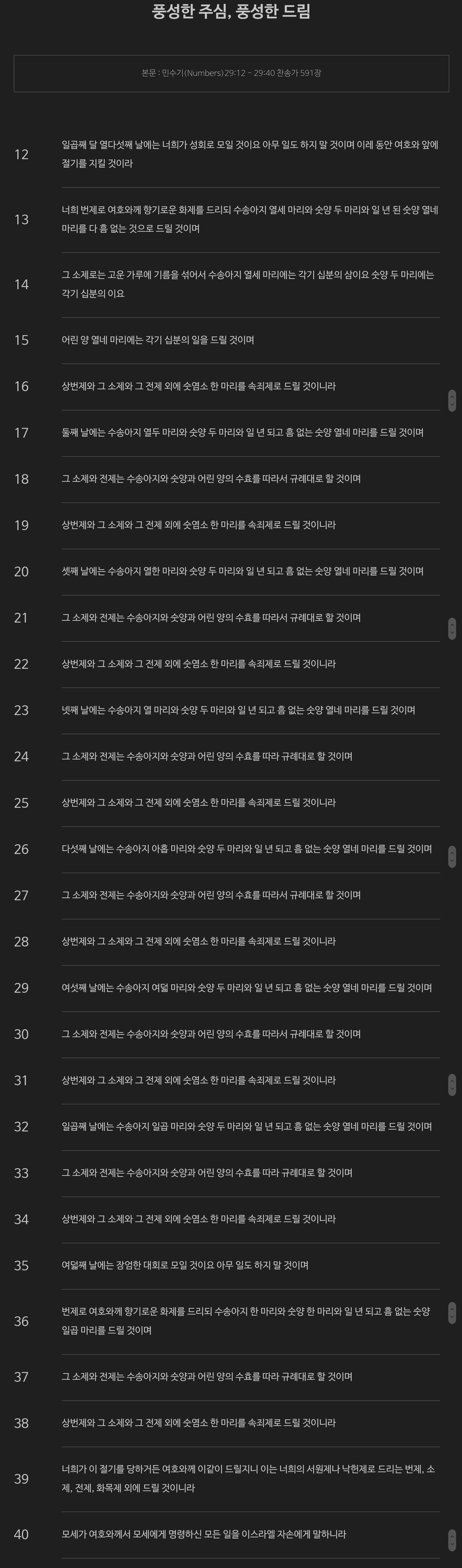 - 그 결과들로 광야에서 태어난 세대가 생길 정도의 40년의 방황 생활과는 달리, 오늘 본문의 장막절에 드리는 번제와 소제의 양은 어마어마하며 그 풍족함이 다 느껴집니다. 그리고 이 긴 기간동안은 불평이 없는, 은혜에 대한 감사의 마음만 가득한 기간이 아니었을까 생각합다.