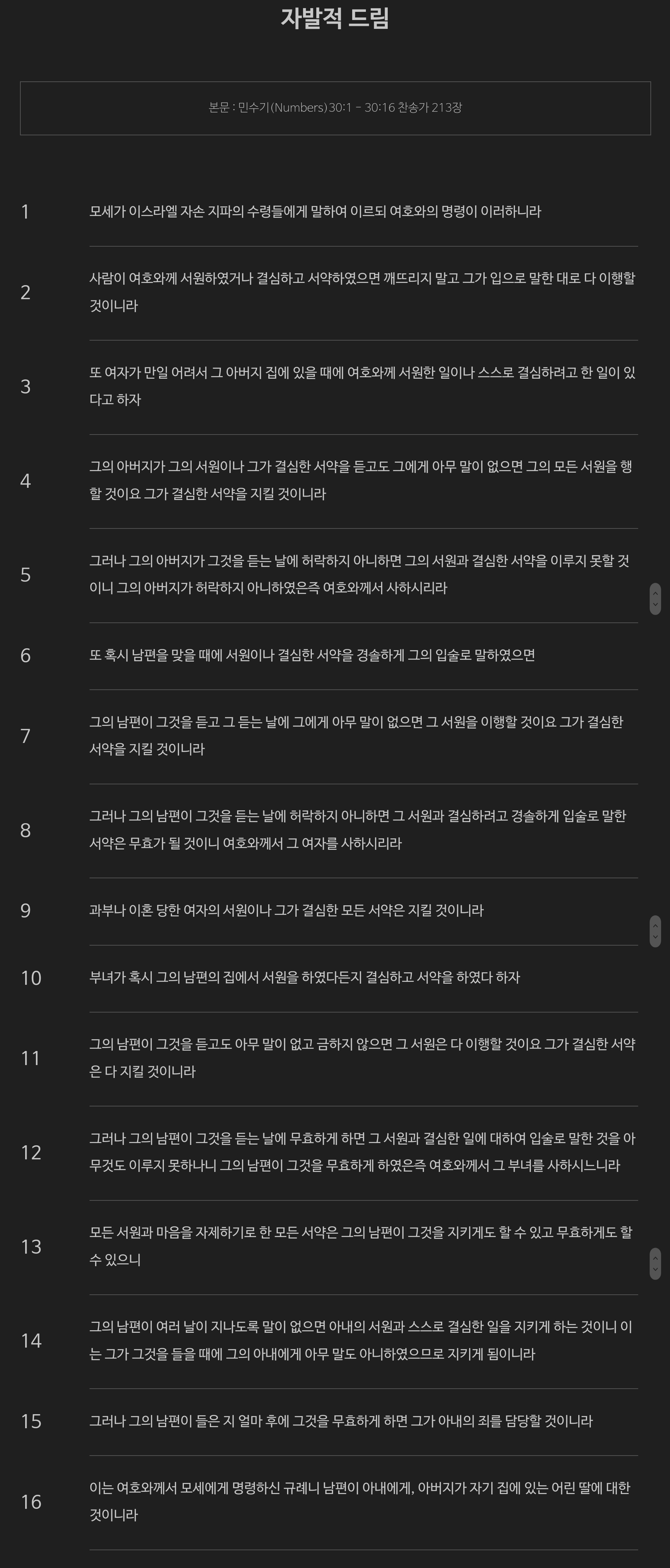 - 사회적 약자를 위한 계획하심을 넘어 가족끼리 전우애를 가질 수 있도록 계획하신 세세함에서 하나님의 사랑이 느껴집니다. 또한 하나님 앞에 나아가는 것 자체는 언제든 가능하지만, 하나님께 드리는 약속은 진심됨에 간절할 수 있는, 정직함에 진지할 수 있는 기도로써 드려야 겠다는 묵상을 하게 됩니다.