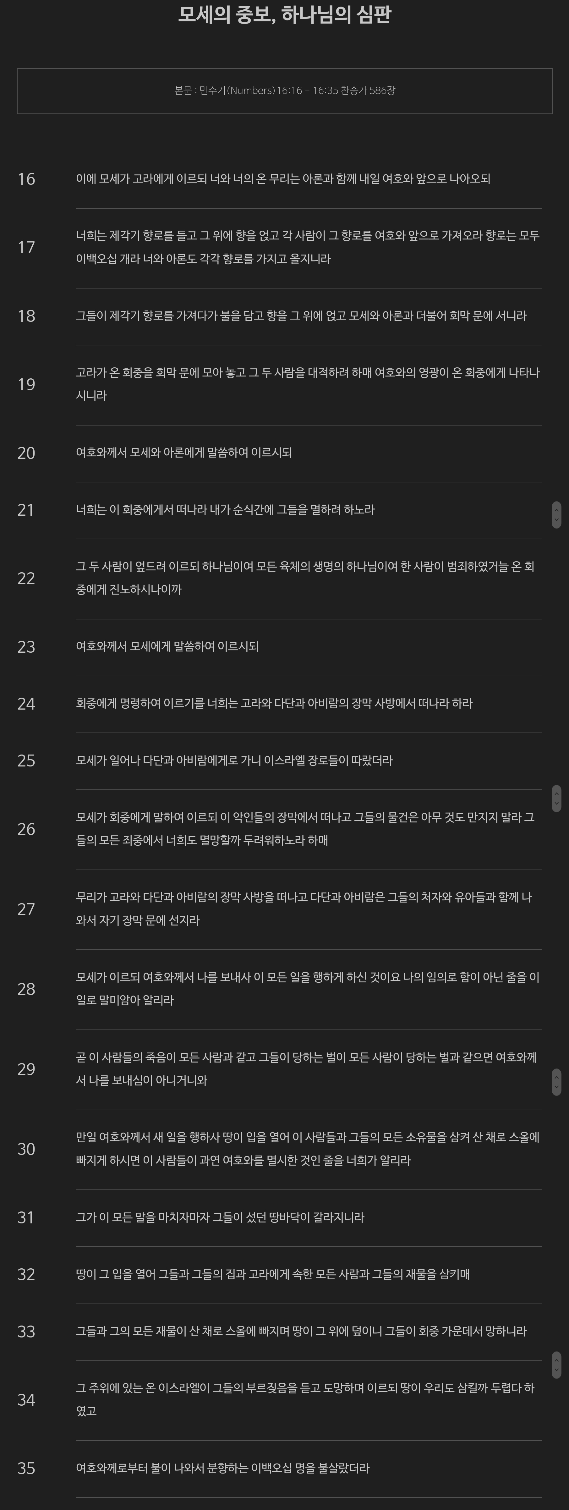 - 이어서 하나님께서 나타나셔 심판이 있을테니 물러나 있으라 경고하십니다. 이에 모세는 기도를 하는데, 15절에서 자신의 결백을 고백하며 고라 일당에 심판을 구하는 기도와는 다른듯한 기도를 합니다. 22절에서는 구원의 기도와 함께 죄 지은 사람에 대해서만 심판을 구하는 기도를 합니다. 잠시 헷갈리는 부분이 있지만, 전체적으로 하나님 안에서 하나님의 계획과 은혜와 공의를 믿는 모세의 자세이지 않았을까 싶습니다. (민 16:20-24)
