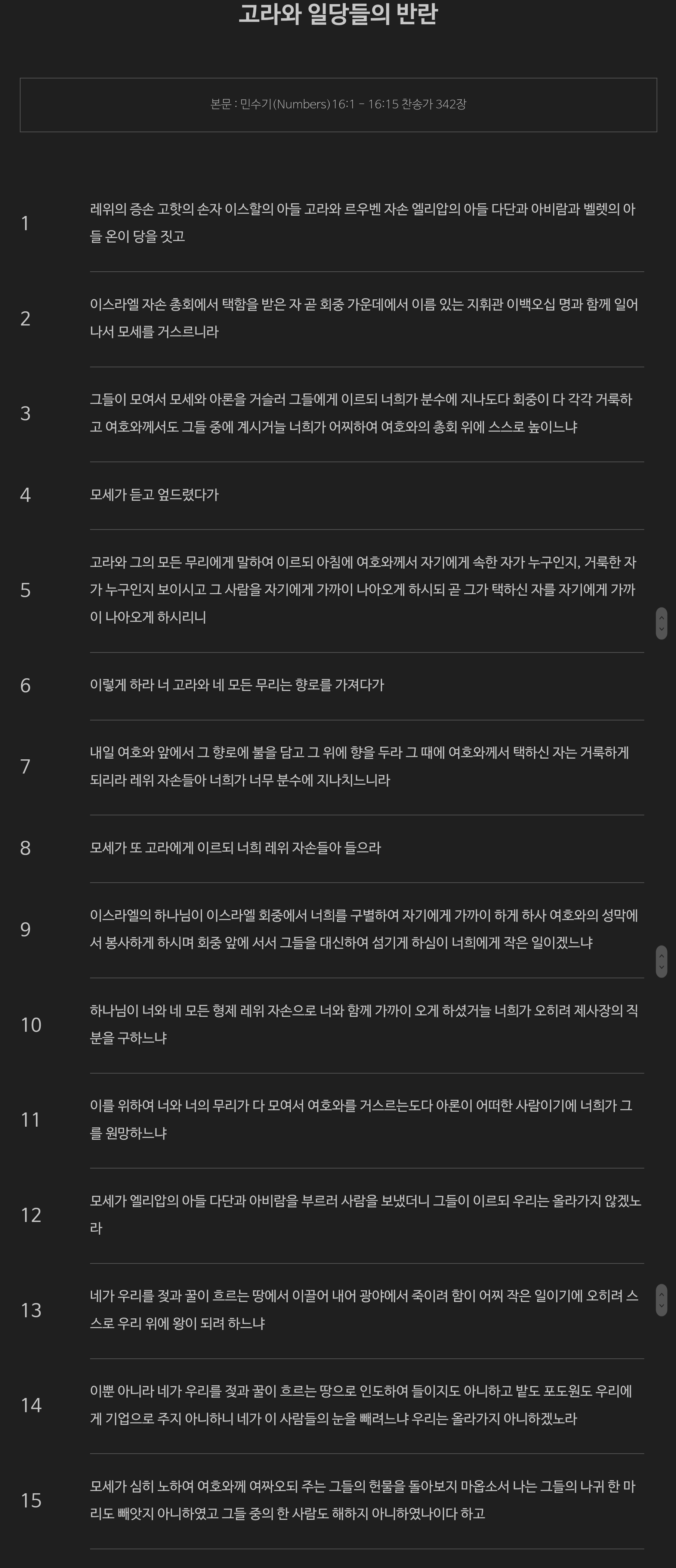 - 이어서 모세는 하나님께 기도를 드리고, 그들에게 하나님을 알게 하기 위한 방법을 전합니다. (민16:4-7) 그리고 이어서 모세는 주님의 일하심에 대해 다시 전달하면서, 그들 명분의 본질을 꼬집으며 하나님의 뜻을 거스르지 않도록 다시 경고합니다. (민16:8-11)