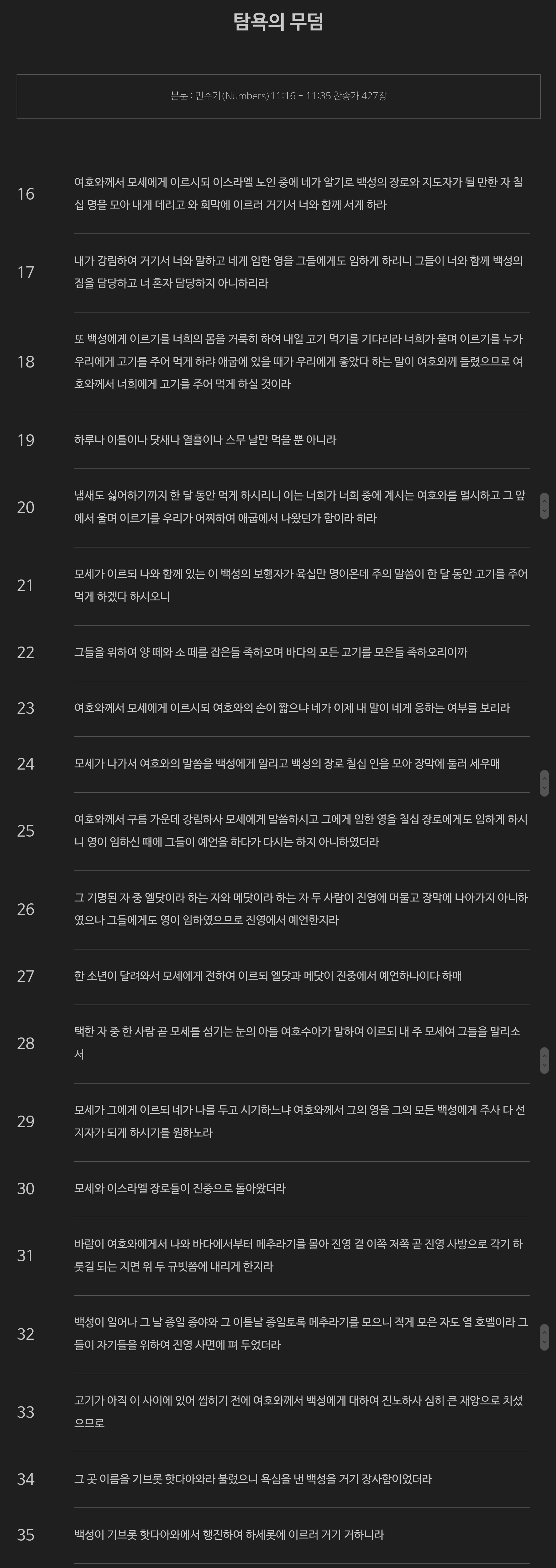 - 민수기 11장 16절 이전의 모습을 보면, 당시 이스라엘 백성들은 자신들이 필요할 때에 하나님을 찾고, 은혜가 내린 후에는 화장실 들어갈 때와 나올 때가 다른 사람처럼 언제 그랬냐는 듯 감사하는 마음 없이 불평과 원망만 합니다. 그저 주어지는 식량인 만나에 감사하는 대신 고기 먹고 싶다고 징징대죠. (민 11:1-9)
