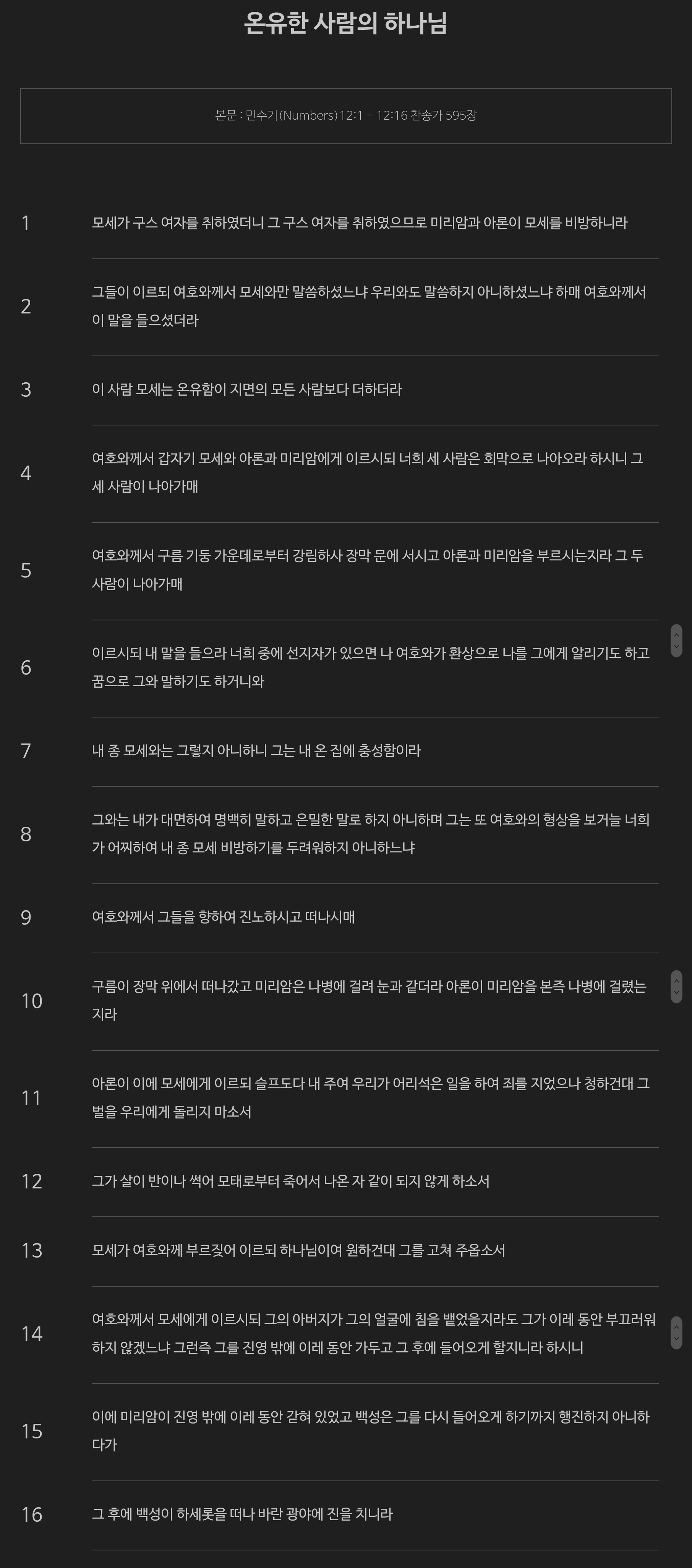 - 어제의 민수기 11장과 연달아 오늘 민수기 12장까지 모세가 이래저래 참 힘들었을 것 같습니다. 어제는 메추리 사건으로 백성들의 원망과 불평속에서 얼마나 마음 고생이 많았을까 싶은데, 오늘은 가족들에게도 공격을 당하니 얼마나 힘들었을까요… 그래서 개인적으로는 12장 3절에서 온유함을 보인 것이 한편으로는 사람인데 얼마나 지쳤을지, 또 한편으로는 정말 인내심이 대단하다는 생각을 했습니다.