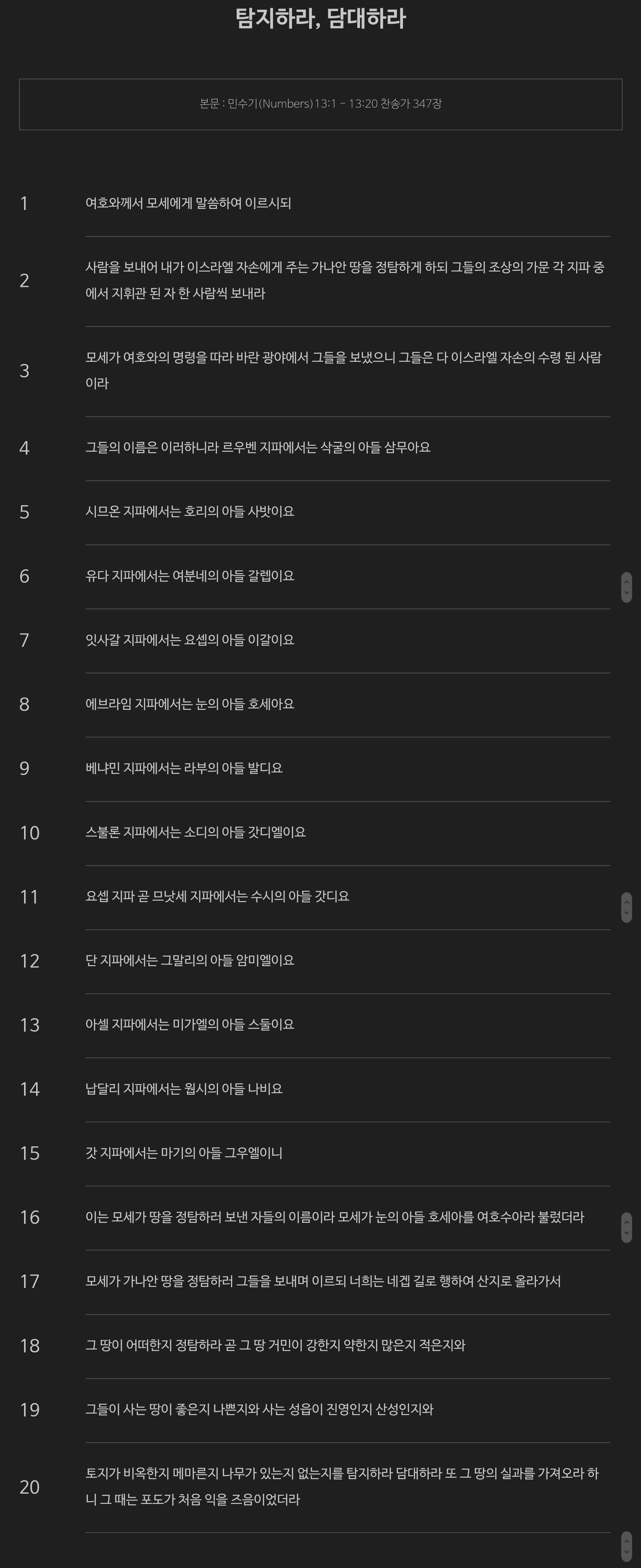 - 사실 이 모습은 높은 그리고 험한 현실의 벽을 느끼며 살아가는 우리의 모습이랑 비슷해 보입니다. 또한, 모세와 갈렙 그리고 정탐을 갔던 사람들 사이의 다른 생각은 우리도 항상 마주하는 두 갈래 길 같습니다. "그 현실의 벽에 좌절하며 하나님을 믿지 않을 것인지, 아니면 하나님을 믿으며 그 무서운 현실을 담대하게 바라보고 나아갈 것인지" 말입니다.