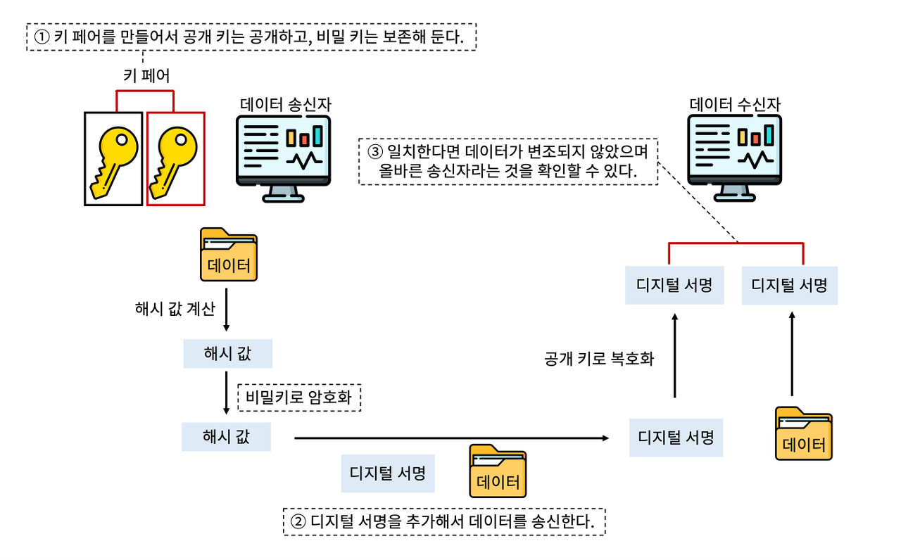 전자 서명에서 사용되는 공개키 암호화 기술은 대칭키 암호화와 달리, 서명과 검증에 서로 다른 키를 사용합니다. 즉, 서명에는 개인키를 사용하고, 검증에는 공개키를 사용합니다.